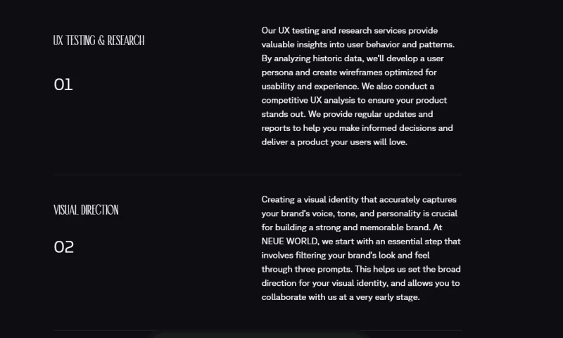 At Neue World, we are a dedicated UI/UX agency that aims to bridge the gap between your business requirements, data-driven decisions, and thorough research, to create usable and modern products that are worth showcasing to the world. Our team of experts utilizes their skills in user experience and interface design to help you achieve your product goals. We understand that a successful product must be user-centric, engaging, and visually appealing, and that's why we're committed to delivering high-quality products that meet these standards. Trust us to help bring your vision to life and exceed your expectations.