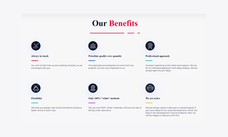 We create conditions for engagement through effective promotion and optimization. We will always find non-standard, but effective approaches to work. We dont like to talk, we like to do our job perfectly. We strive for every employee to know and share our values and principles of work.
