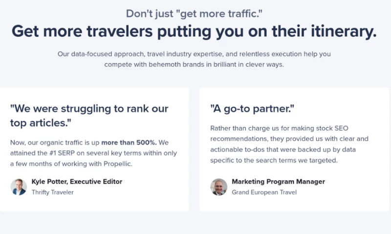 We, hired Propellic to increase traffic and leads from targeted product categories and content pages. Propellic successfully implemented SEO strategies to improve our keyword rankings, delivering on time and meeting quality expectations. We're very impressed by the work being done at Grand European Travel and enjoyed working with their dedicated team on an SEO project over the past two months. "Project Name: SEO Services