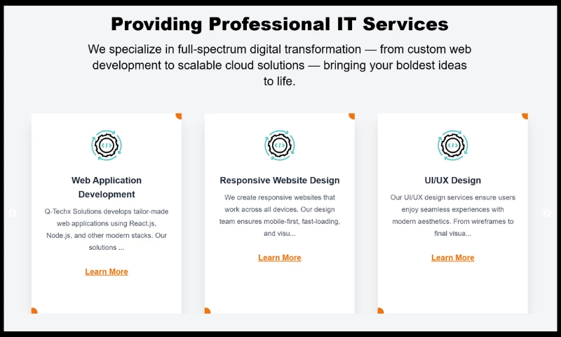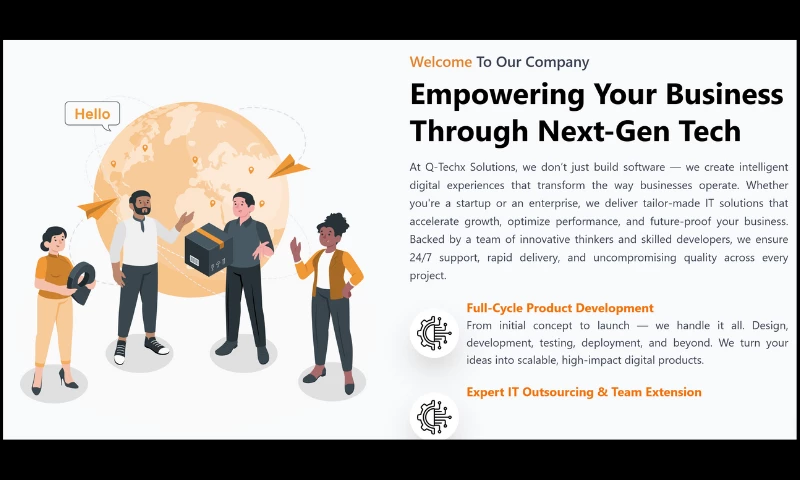 We also provide outsourcing and dedicated developer services, allowing businesses to scale quickly and cost-effectively. Whether you need a complete project team or individual specialists, Q-Techx Solutions ensures smooth communication, transparency, and on-time delivery.