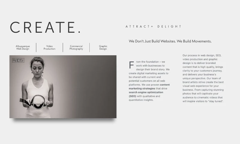Our process in web design, SEO, video production and graphic design is to deliver branded content that is high quality, brings clarity to your customers journey, and delivers your business’s unique perspective. Our team of brand artists strive create the best visual web experience for your business. From capturing stunning photos that will captivate your audience to cinematic videos that will inspire visitors to “stay tuned”.