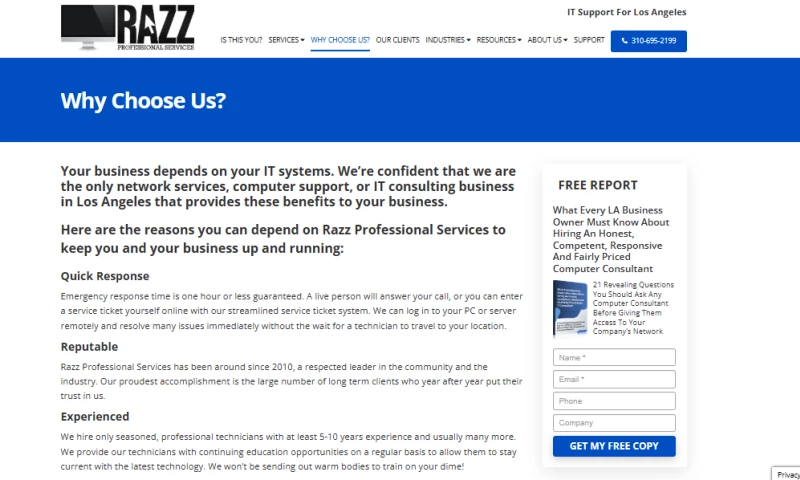 Razz Professional Services stands out for its superior response times, streamlined IT processes, and dedication to client satisfaction. With a track record of success and notable clients such as Premier Insurance Services, Size Matters, Creators Syndicate, and Donenfeld & Associates, Razz Professional Services is the go-to choice for small businesses seeking reliable IT solutions in Los Angeles.