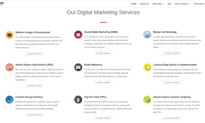 We offer a wide array of services at Redhawk Marketing to provide you with a one-stop solution for all your digital needs, including Web Design and Development Services, Search Engine Optimization (SEO), Email Marketing, Creative Design Services , Search Engine Marketing (SEM), Social Media Marketing (SMM), Pay Per Click (PPC), Banner Ad Marketing, landing page design & marketing, and other consulting services to help your business succeed in the changing business world.