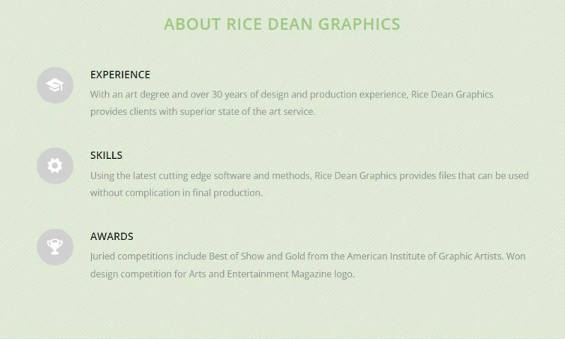 RICE DEAN GRAPHICS specializes in professional graphic design of web, print, and display media in a wide variety of formats including: custom logos, website development, marketing collateral, exhibit graphics, annual reports, catalogs, newsletters, manuals, and much more.