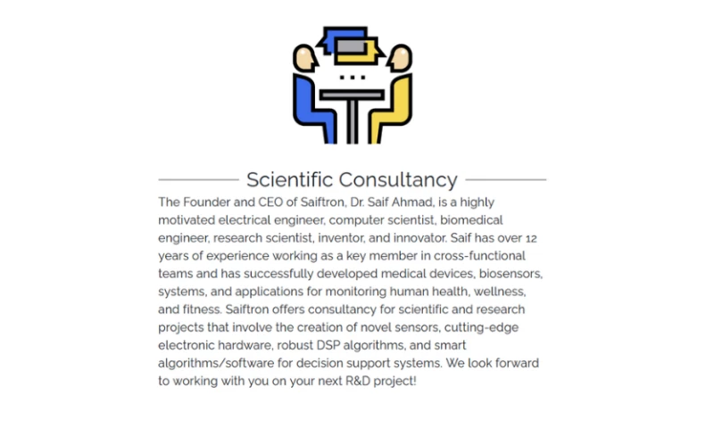 Saiftrons broader vision is to bring technologies like digital signal processing (DSP), intelligent algorithms, pattern recognition, and statistical analysis to smartphones/smartwatches, thus enabling these devices to be used as powerful decision support systems and disseminating this knowledge to a diverse audience worldwide.