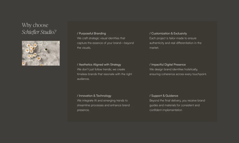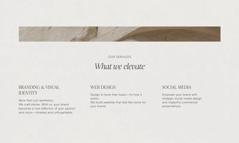 Where stunning visuals meet deep-rooted strategy. Our process unites intentional design and meaning, creating timeless brands that balance aesthetics, elegance, and functionality. We work with bold and ambitious brands, valuing genuine connections and excellence, to deliver impactful results that resonate beyond passing trends.