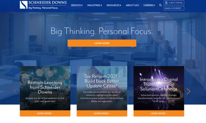 At Schneider Downs, we're proud that we've built a client list of powerful Fortune 500 companies, well-established regional businesses, not-for-profits and exciting start-ups. But we are even prouder that we have never lost focus on what is really important: the personal connections we make with every one of our clients. We provide them national and international-level expertise, while volunteering in the neighborhoods they live in. We know what matters to their businesses, and we care deeply about what happens in their lives. Big Thinking. Personal Focus. This is what has made us who we are today, and this is what will guide our purpose and actions in the future.