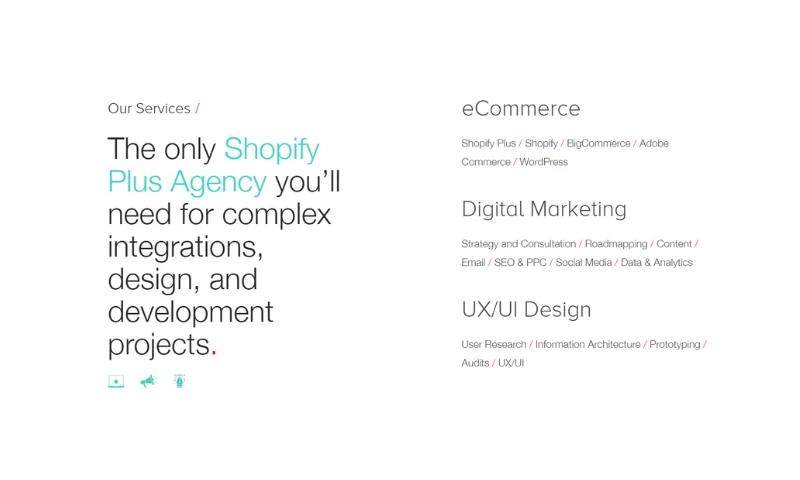 Our team offers a range of services, including design, development, and growth services, designed to provide a highly customized eCommerce experience that's true to your brand and enticing to your customers. We work with trusted partners such as BigCommerce, Shopify, and Adobe Commerce to build or migrate your online store, leading to faster site speed, better performance, and more sales.