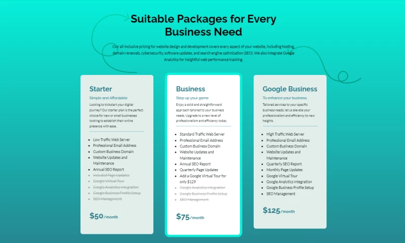 Opt for our Google Business package, and we'll power your website with high-traffic hosting, monthly page updates, full Google integration, and expert keyword optimization that will make help your website get the traffic and conversion it needs. We'll closely monitor your website's performance, ensuring you stay ahead of the competition and bask in the spotlight.