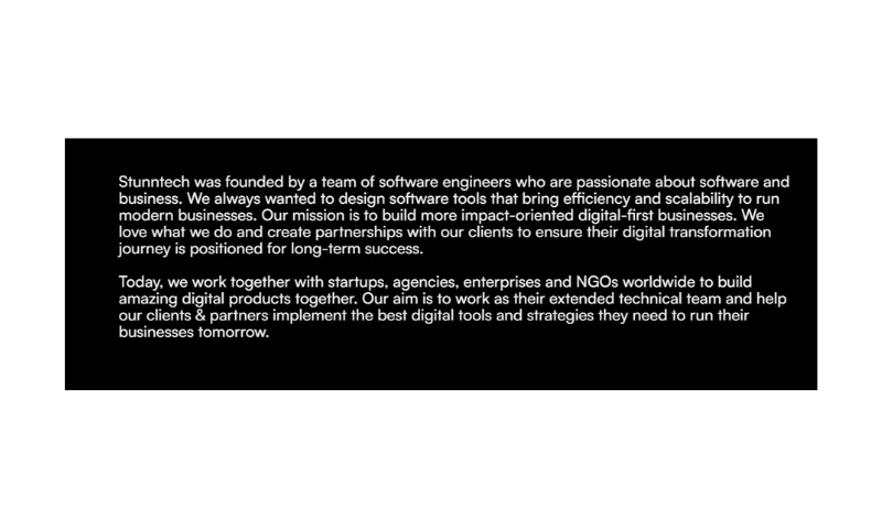 Stunntech is a team of tech-savvy professionals dedicated to crafting innovative digital solutions to address business needs. From custom software development to creating hybrid mobile apps, we pride ourselves on staying ahead of the technological curve.