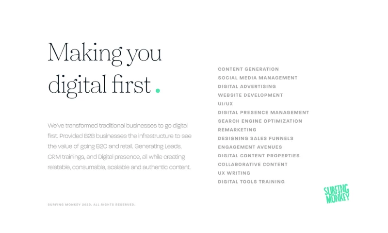 Operating as a fully remote boutique agency, Surfing Monkey serves clients across the globe, including the United States, Australia, the United Kingdom, Singapore, and India. The agency has worked with a diverse clientele, from traditional B2B businesses transforming into B2C brands to Fortune 500 companies needing dynamic digital content. Its expertise includes digital advertising, social media management, user experience design, and content creation, helping clients grow and thrive in an evolving digital world.