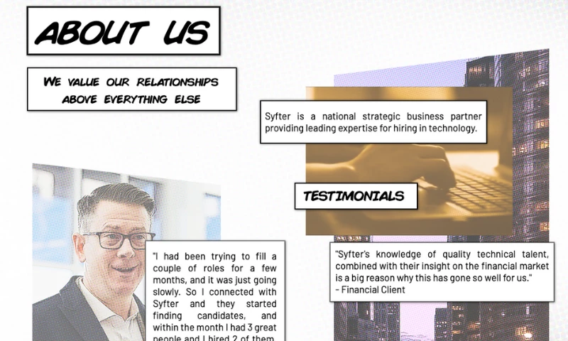 If you're looking for new opportunities in the tech field, look no further than Syfter! The recruiting team was incredibly helpful and responsive throughout the entire process. I came up with several questions and they were all answered in-depth and with a quick turnaround. Coordinating client interviews was a breeze and very accommodating to my schedule, and the same could be said about onboarding with the client. Syfter staff made sure all of my needs were communicated and met in a timely manner.I could go on and on, but I'll end this review with a huge THANK YOU to the Syfter Team for taking such great care of me. Here's to the start of what I hope to be a long-lasting and fruitful partnership. "Justin Baker's Review Sourced from Google