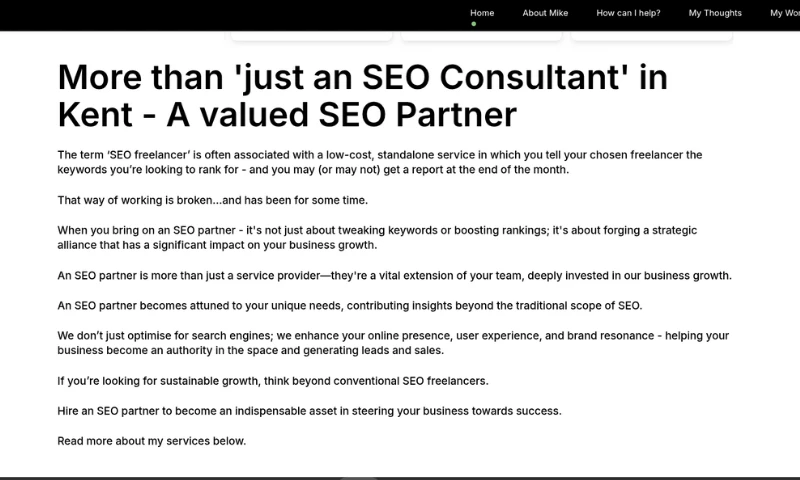 We started working with Mike in the second quarter of 23, he very quickly became a very valued member of our team. His insight and understanding of the dark art of SEO was obvious from the start, he is a master. Mike’s ability to quickly immerse himself in our market and understand our audience is made apparent by the relevant and engaging content he regularly provides. His content and his technical understanding have helped us secure more than a handful of organic number one rankings. We all enjoy working with him and would highly recommend him to anyone who wants to see the difference he can make to your business. "Dawn Beckham's Review Sourced from Google