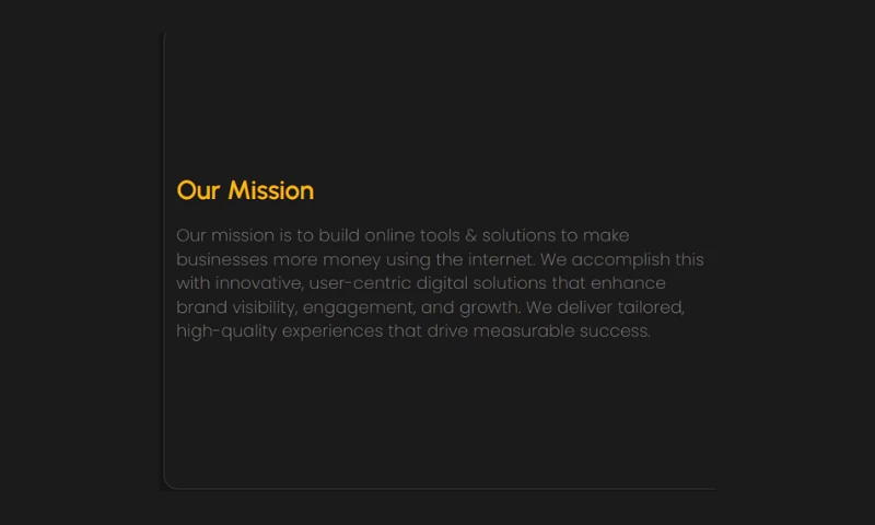 Our mission is to build online tools & solutions to make businesses make more money using the internet. We accomplish this with innovative, user-centric digital solutions that enhance brand visibility, engagement, and growth. We deliver tailored, high-quality experiences that drive measurable success.