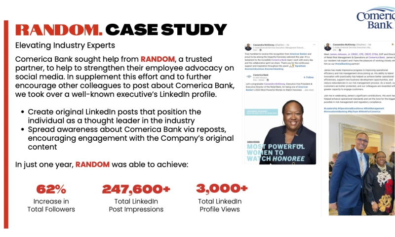 Random has had the pleasure of working with an amazing roster of clients, including Comerica Bank, Borgwarner, DThe Angiogenesis Foundation, Trasca & Co. Eatery, Ram Trucks, Green Giant Fresh, Executive Speakers Bureau, Point Northeast, Merrell, Urban Science, and more.