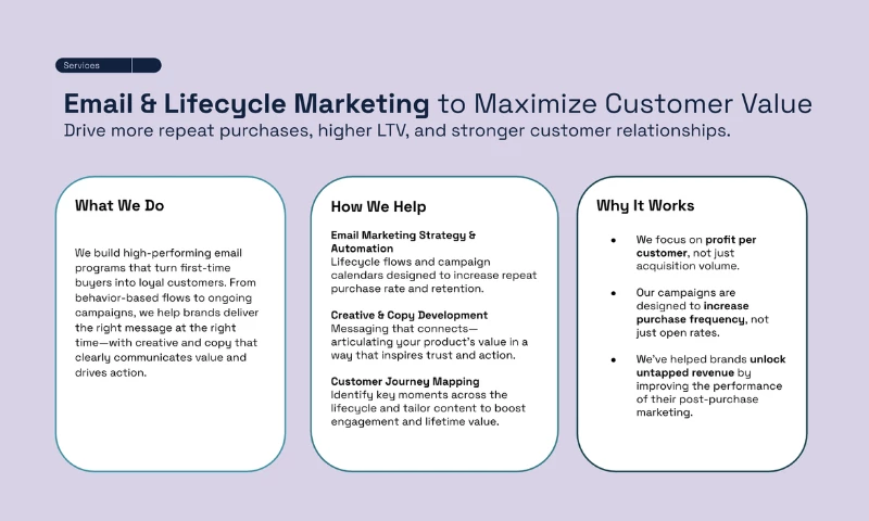 We partner with clients to increase the value of every customerthrough smarter acquisition, better retention, and systems that drive compounding growth over time.
