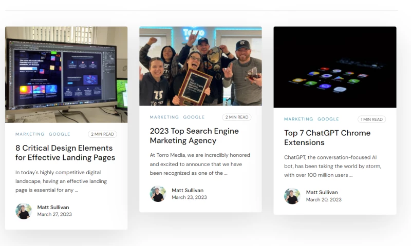 The Torro team is absolutely incredible! They are so knowledgeable about everything web design and helped me through the step by step process of building our new website. My company had some unlikely circumstances, but Matt and his team went above and beyond to accommodate us and our situation. They introduced me to so many different digital resources and never held back on advice or help they could provide. Torro is an undeniable an asset to our company - Great people and even better creatives!! "Victoria Bond's Review Sourced from Google