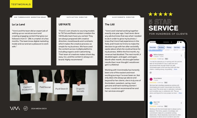 VonniMedia are amazing to work with! The team is incredibly proactive and genuinely obsessed with delivering top performance. They’ve helped us exceed our goals and are always bringing fresh, strategic ideas to keep us ahead of the curve. Shoutout to Paige and Mégane—seriously, they don’t miss a beat. Highly recommend! "Zoe Fehlberg's Review Sourced from Google