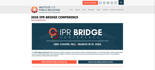 IPR Bridge Conference is a two-day PR and communications event that brings together communication leaders, practitioners, and scholars to share and discuss cutting-edge research and its practical implications for the profession.