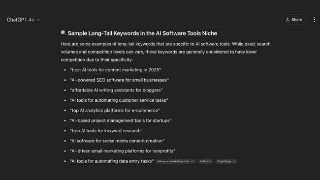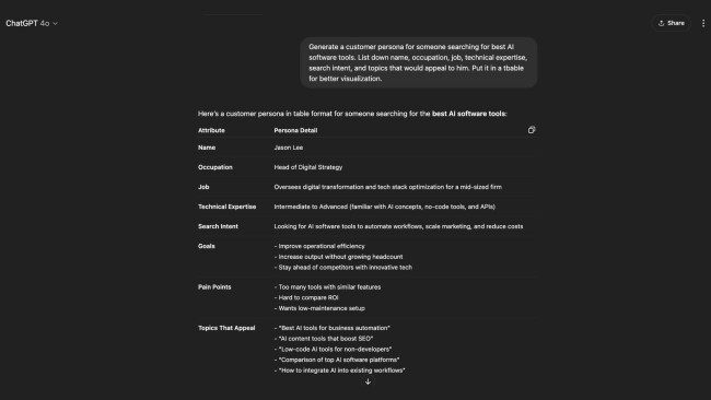 SEO success depends on understanding who you’re talking to. ChatGPT can help you define and refine ideal customer profiles (ICP), including their pain points, need states, and search behaviors. By simulating different buyer types, the SEO tool can help tailor your messaging and content strategy to match what those audiences are actually looking for. In my workflow, I use ChatGPT to banter questions my audience might have and build content directly around those prompts.