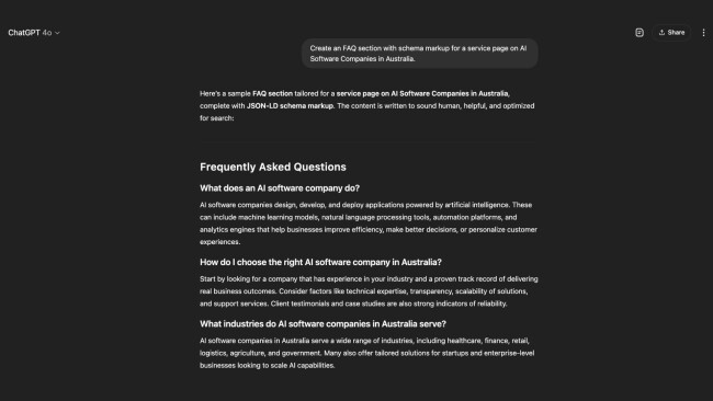 - “Create an FAQ section with schema markup for a service page on [primary keyword] in [target location].”