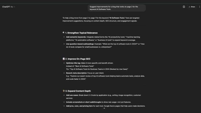 - “Suggest improvements for a blog that ranks on page 2 for the keyword [primary/secondary keyword].’”
