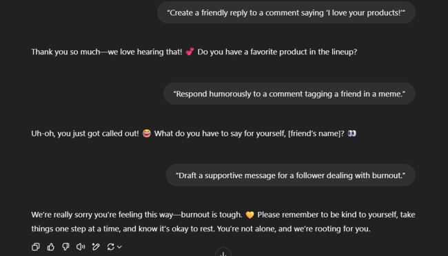 What’s more, personalized replies make followers feel valued. Whether you’re expressing gratitude, addressing feedback, or simply continuing a friendly exchange, AI-powered responses, when properly prompted, can reflect your brand’s character.