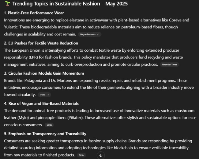 Sample prompt 1 with a result below: “What are some trending topics in sustainable fashion this week?”