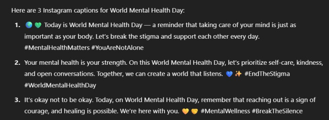 Sample prompt 2 with a result below: “Generate 3 Instagram captions about World Mental Health Day.”
