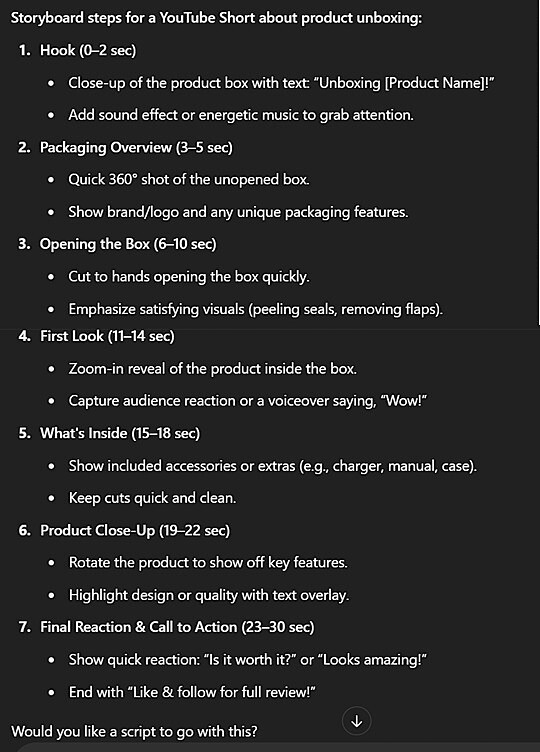 Prompt for video storyboarding:“Suggest storyboard steps for a YouTube Short about product unboxing.”