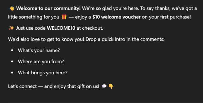 See the result I got using the prompt: “Write a welcome post for new followers, offering them a $10 welcome voucher and encouraging them to introduce themselves.”