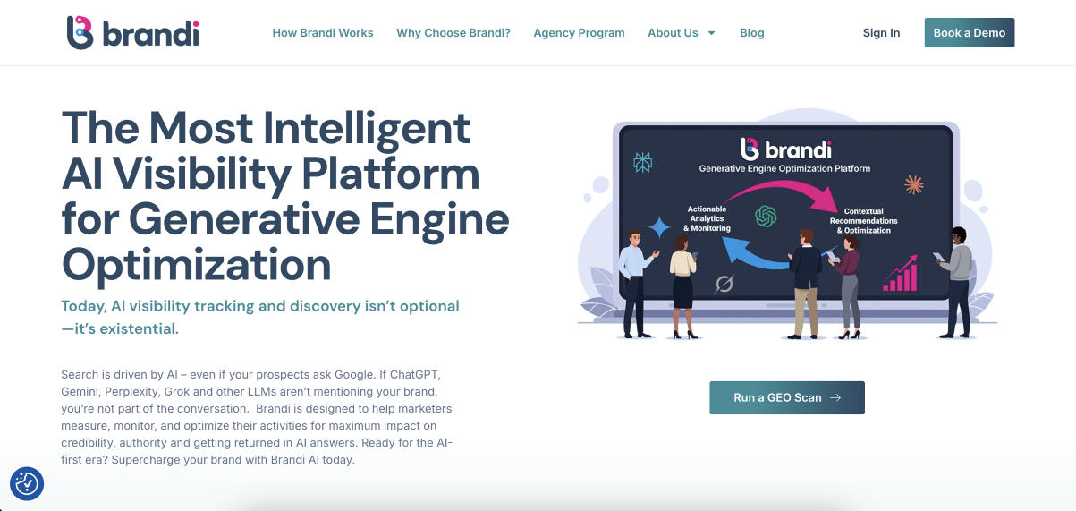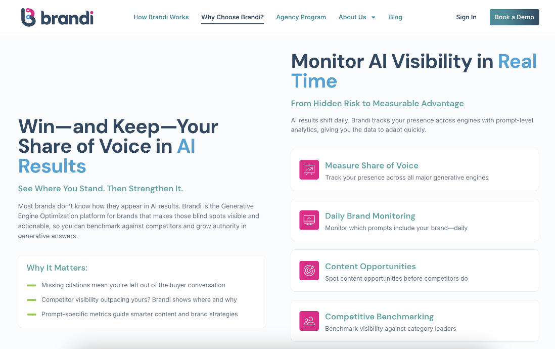 Brandi AI combines AI visibility tracking, competitive benchmarking, and content optimization guidance into a single system.