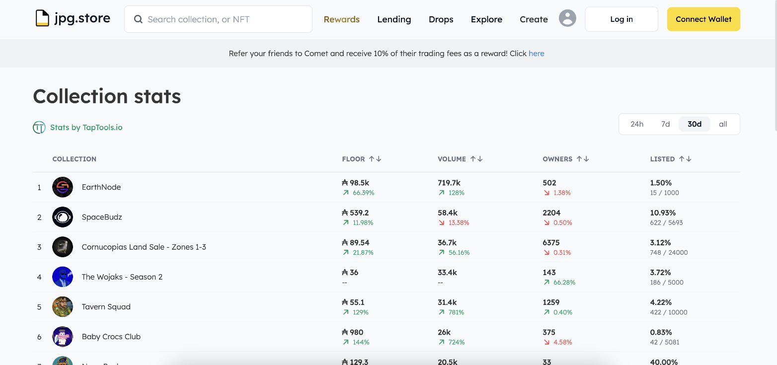 JPG Store is the largest NFT marketplace on the Cardano blockchain, remaining active thanks to a low-fee, eco-friendly network and engaged community.