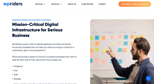 WPRiders is a one-stop-shop WordPress development company that provides plugin development, API integration, platform migration, web design, website audit, and support and maintenance. It offers supplementary services like conversion rate optimization (CRO), search engine optimization (SEO), eCommerce development, and full small and medium enterprise support. Considered one of the most reliable WordPress developers, WPRiders has delivered over 1,550 projects and served 500 clients with a net promoter score (NPS) of 9.2.