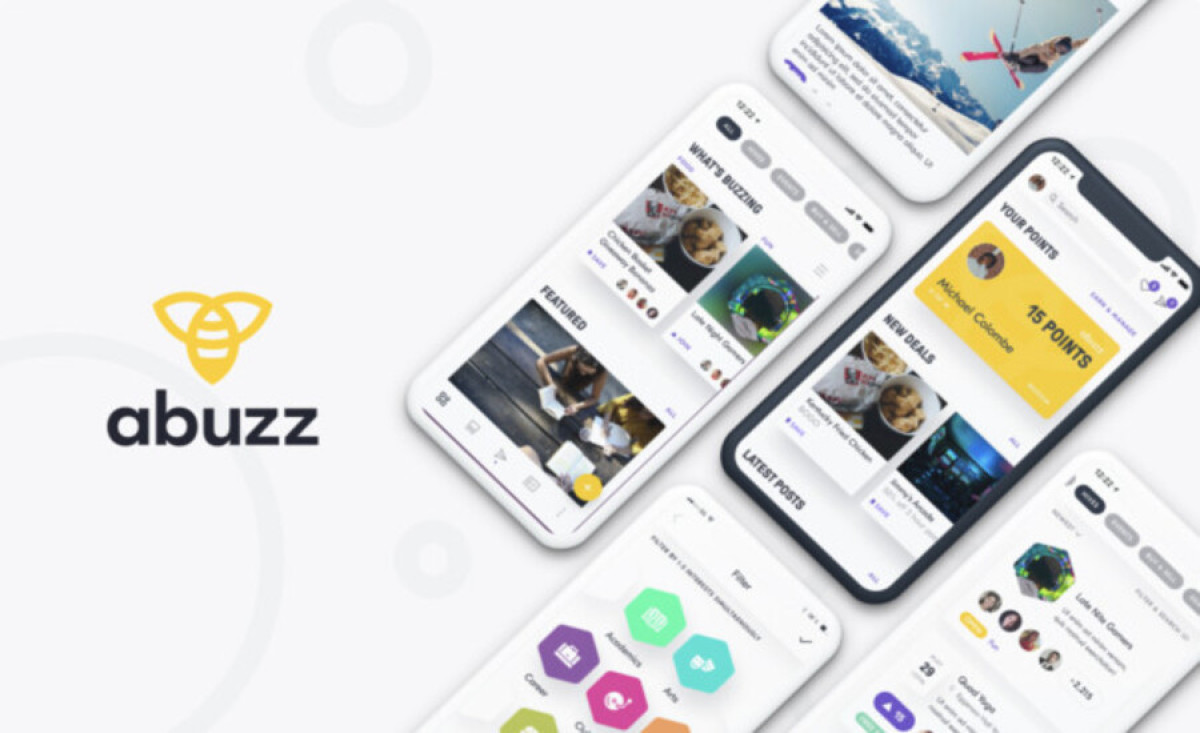 abuzz features a solid color palette, with a bright yellow emphasizing a youthful energy. Bees and beehive visuals evidently influence the design. It has hexagon shapes, referring to the interconnectedness between students’ interests and activities.