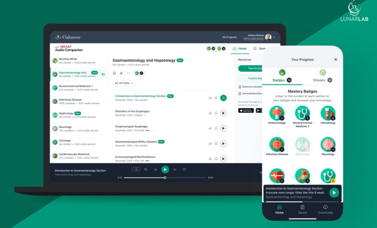 Inspired by successful learning apps like Duolingo, the MKSAP Audio Companion integrates badges, streaks, and progress bars to motivate consistent use.