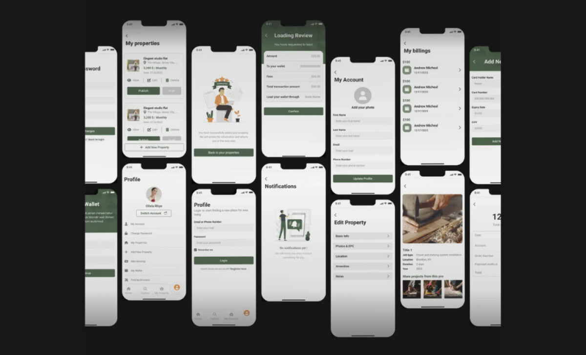 Ooh Rent uses a card-based layout across the Android and iOS app. You can see this clearly in the "My Properties" and "Billing" sections.