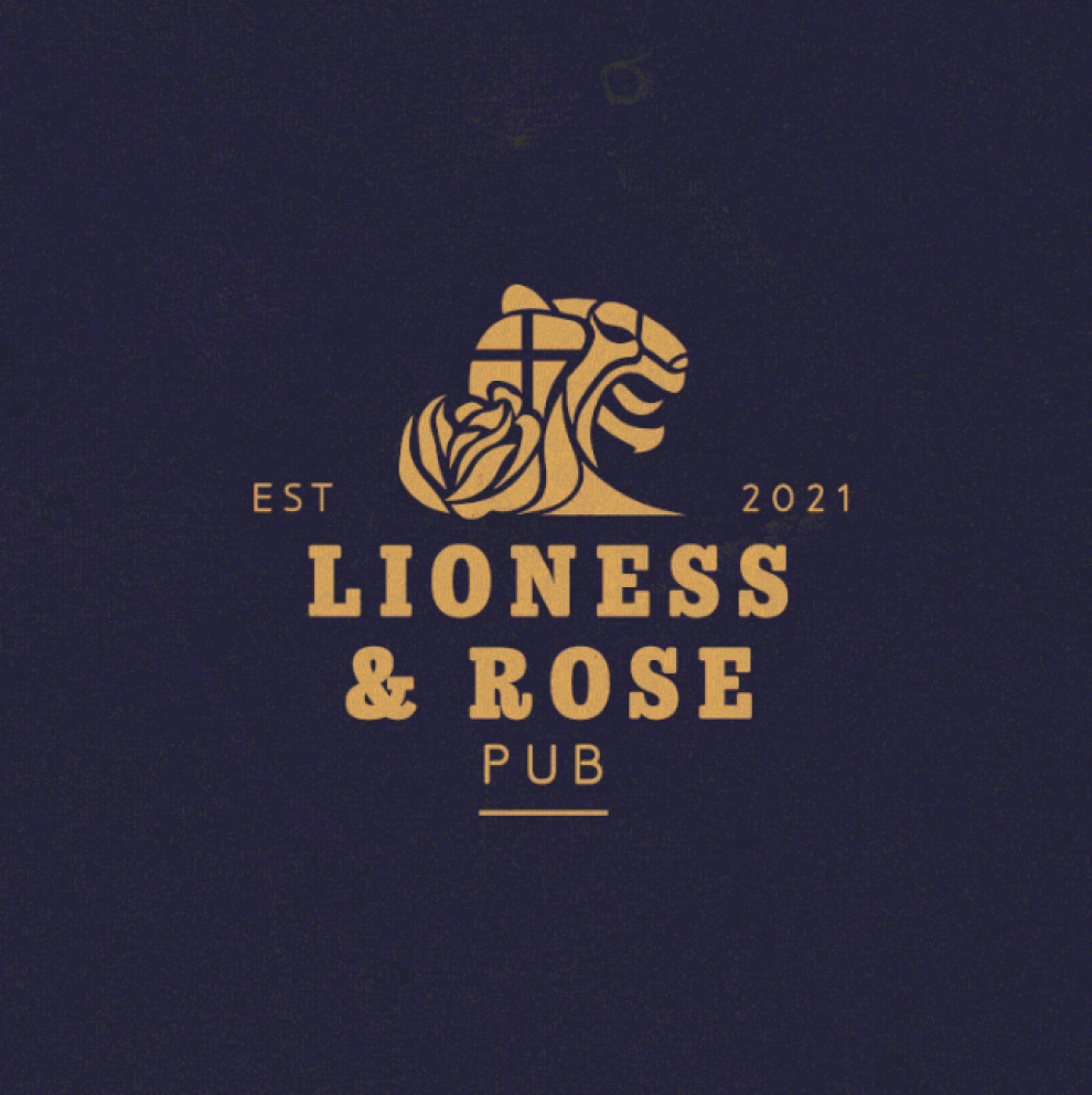 Prem Desai's logo design for Lioness & Rose Pub blends traditional British pub aesthetics with a modern celebration of women's football. The golden color of the text and the lioness image radiates warmth, reflecting the prestige and glory of football.
