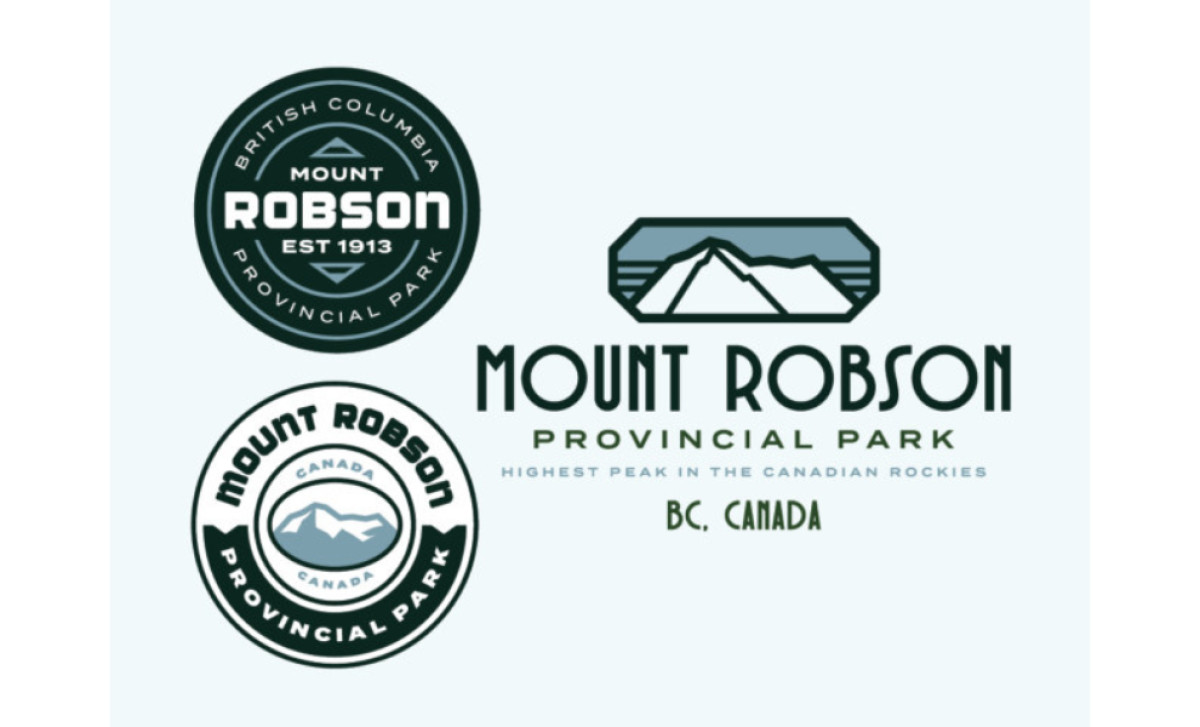 Logo design agency acreativeal's concepts for Mount Robson Provincial Park capture the nostalgic vibe of vintage badges. The designs feature a dominant dark green color reminiscent of the park's lush natural scenery.