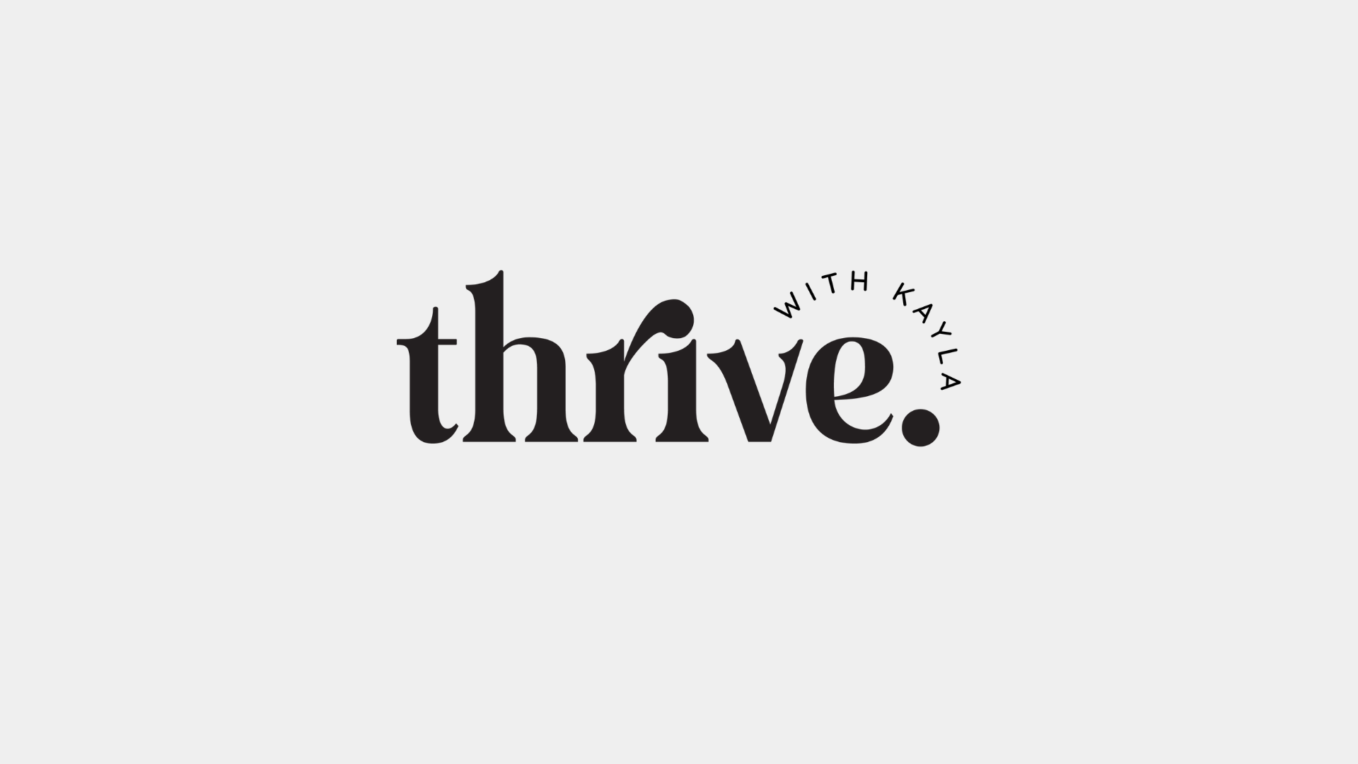 The typographic arrangement creates a pleasing balance. The main wordmark "thrive." is anchored by its period. Above it, the smaller "WITH KAYLA" tagline arcs gently, introducing a friendly, organic counterpoint to the structured serif.