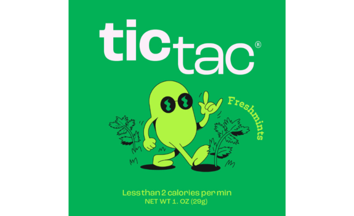 The varying vibrations are represented through a slick bolded “TIC” positioned slightly above the regular “TAC.” This displacement simulates a visual experience that equates to the funky sound the packaging makes, with the contrast emphasizing the rhythm.