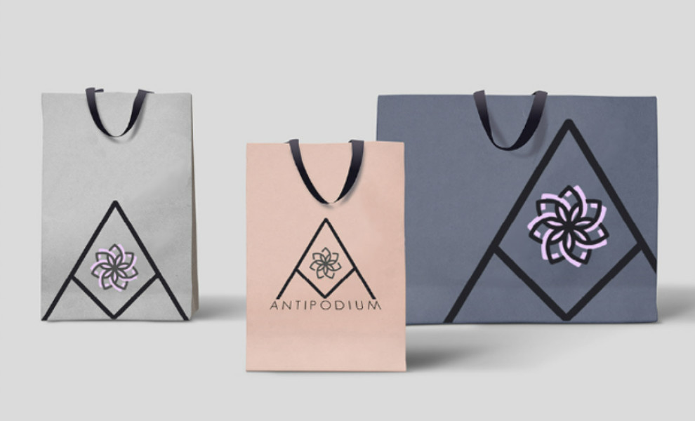 Chloe Lloyd's logo design for Antipodium combines a flower emblem, gentle colors, and sharp objects and fonts, creating a feminine and edgy look. At the heart of the logo is a stylized flower symbol, which imparts a gentle and feminine feel to the design. This emblem is central to the brand's identity, symbolizing beauty and style.