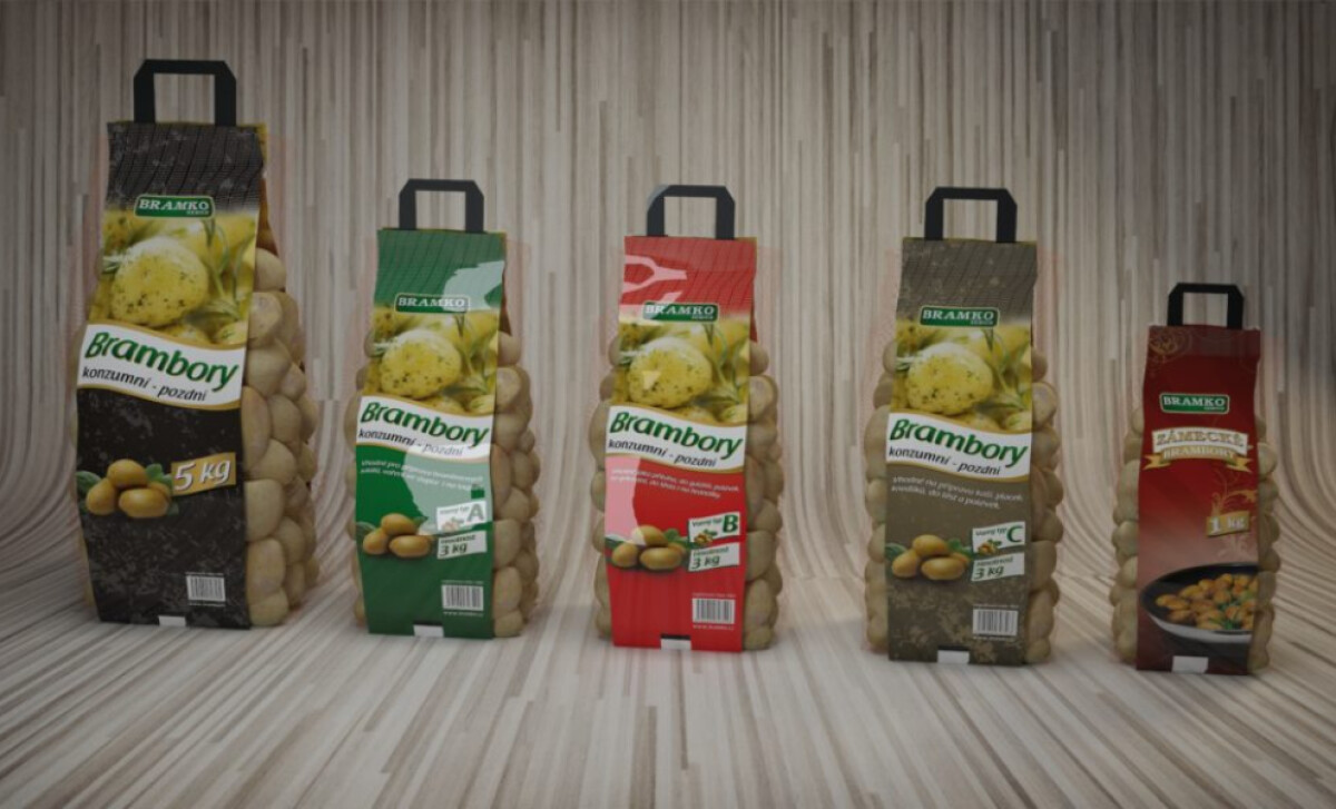 The food packaging design uses distinct color-coding for each product. For example, the 5 kilogram potatoes use black, while the smallest pack comes in red. This allows consumers to confidently identify and select their preferred item at a glance.