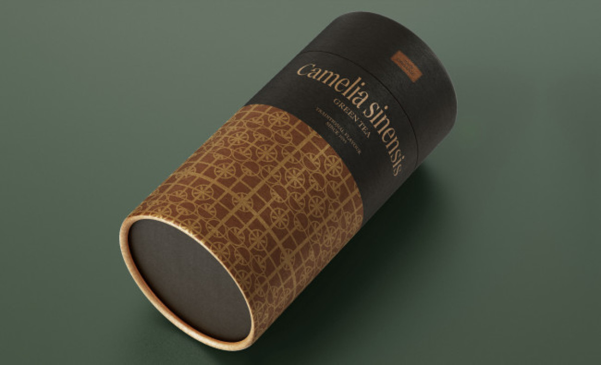 mariancreations' packaging design for Camelia Sinensis features premium-looking canister packaging that combines functionality with aesthetics. The packaging is divided into a solid color on top and a Chinese-inspired pattern at the bottom using earthy colors.