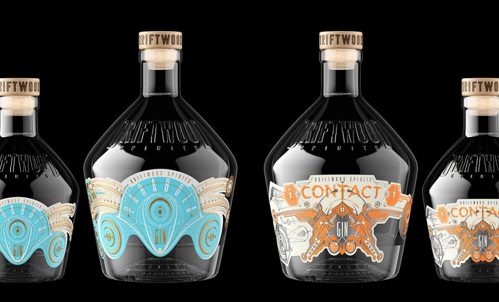 For Driftwood Spirits, design agency Hired Guns Creative has meticulously developed a captivating packaging design. It features a custom glass bottle design with unique details at the bottom punt.