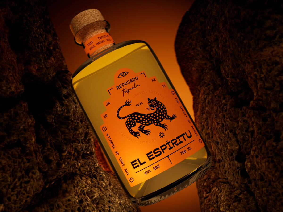 Vailio Agency built El Espíritu’s identity around ritual and craft. The packaging combines jaguar iconography, sacred motifs, and a palette of burnt orange, obsidian black, and agave teal to tie the tequila to its cultural roots while projecting a modern edge.