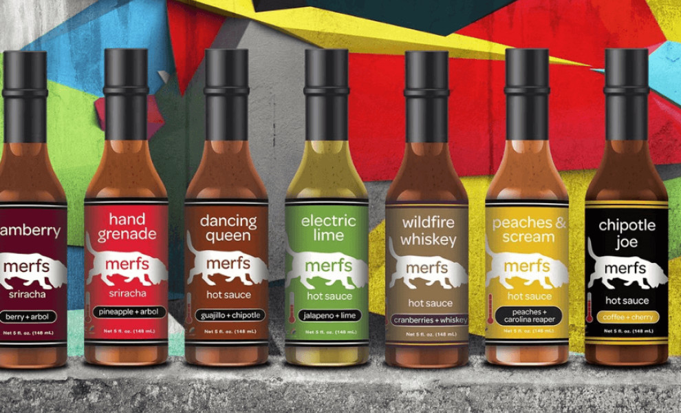 Brink Design Studio's packaging design for Merfs Condiments is a vibrant and practical representation of the product’s spicy nature.