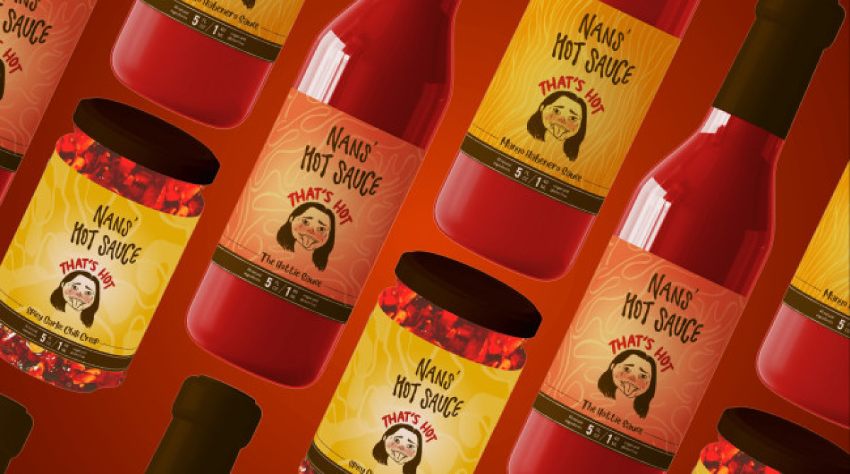 For Nans' Hot Sauce, label designer Nandini Desai created a whimsical and engaging design. Her label design features funny illustrations (a self-portrait depicting a reaction to spicy food) and a punchy "That's Hot" tagline. The warm and bold color story enhances the playful vibe, making it appealing to younger consumers.