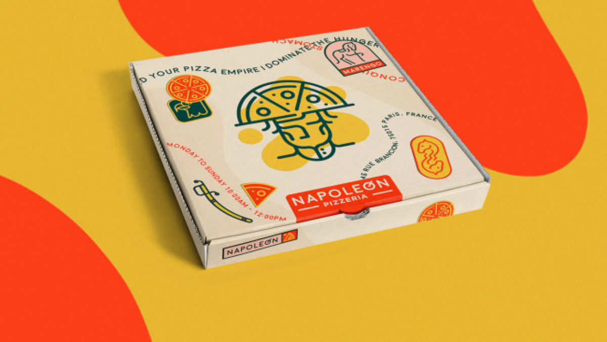 The pizza box design is a testament to the brand's fun character. The designer combined the witty Napoleon illustration with a radiant blend of orange, yellow, and red to add that friendly feel.