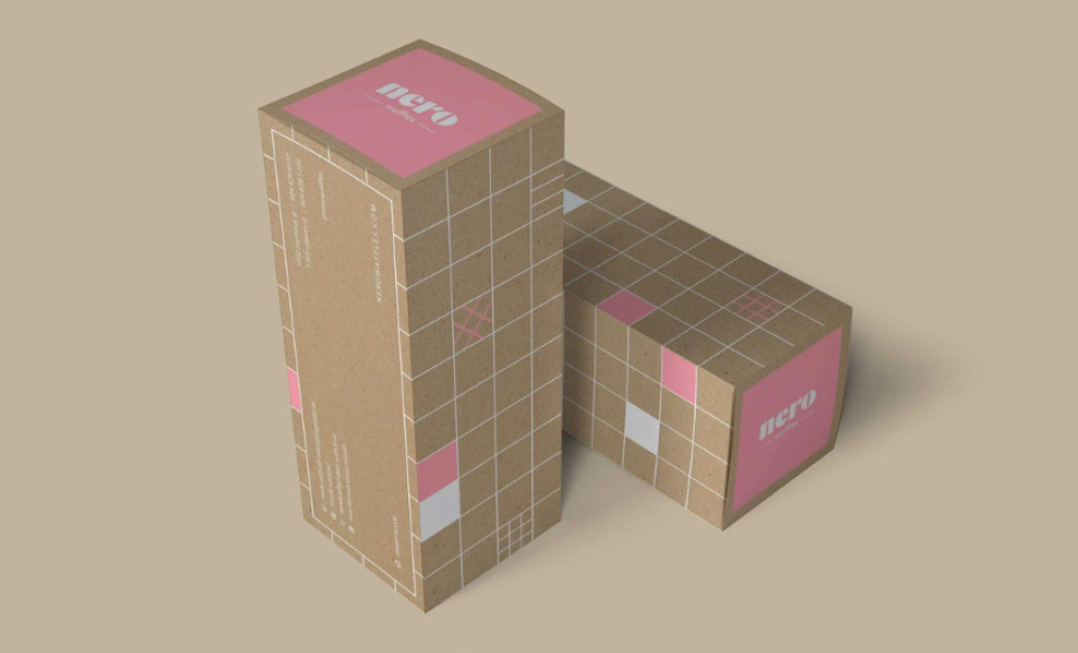 The sleek rectangular box, made from natural kraft material, stands out with its minimalist grid design, adorned with pink shades and lines. Its simplicity aligns with the brand's focus on sustainability and functionality.